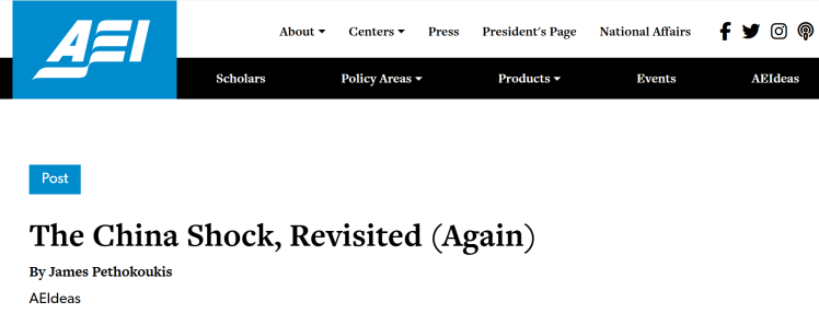 當(dāng)前全球經(jīng)濟(jì)復(fù)蘇乏力、貿(mào)易保護(hù)主義抬頭,部分西方政客與媒體頻繁炒作“中國沖擊論”,企圖將損人不利己的“關(guān)稅大棒”合理化。美國知名保守派智庫美國企業(yè)公共政策研究所(American Enterprise Institute for Public Policy Research)高級(jí)研究員詹姆斯·佩索科基斯(James Pethokoukis)近日發(fā)文稱,基于大量數(shù)據(jù)分析與案例研究,“中國沖擊論”站不住腳,中國融入全球經(jīng)濟(jì)促進(jìn)了美國經(jīng)濟(jì)增長,實(shí)際上顯著提高了美國人民的生活品質(zhì)。