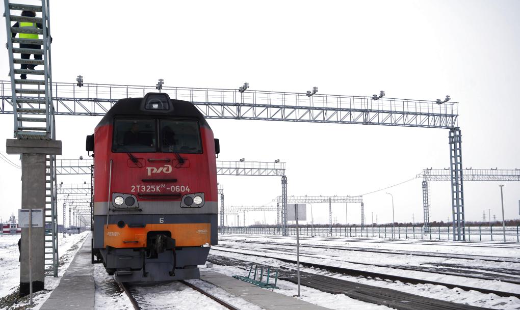 2025年12月6日,一輛即將開往中國的俄羅斯貨運(yùn)列車??吭诙砹_斯下列寧斯闊耶鐵路口岸。新華社記者劉愷攝