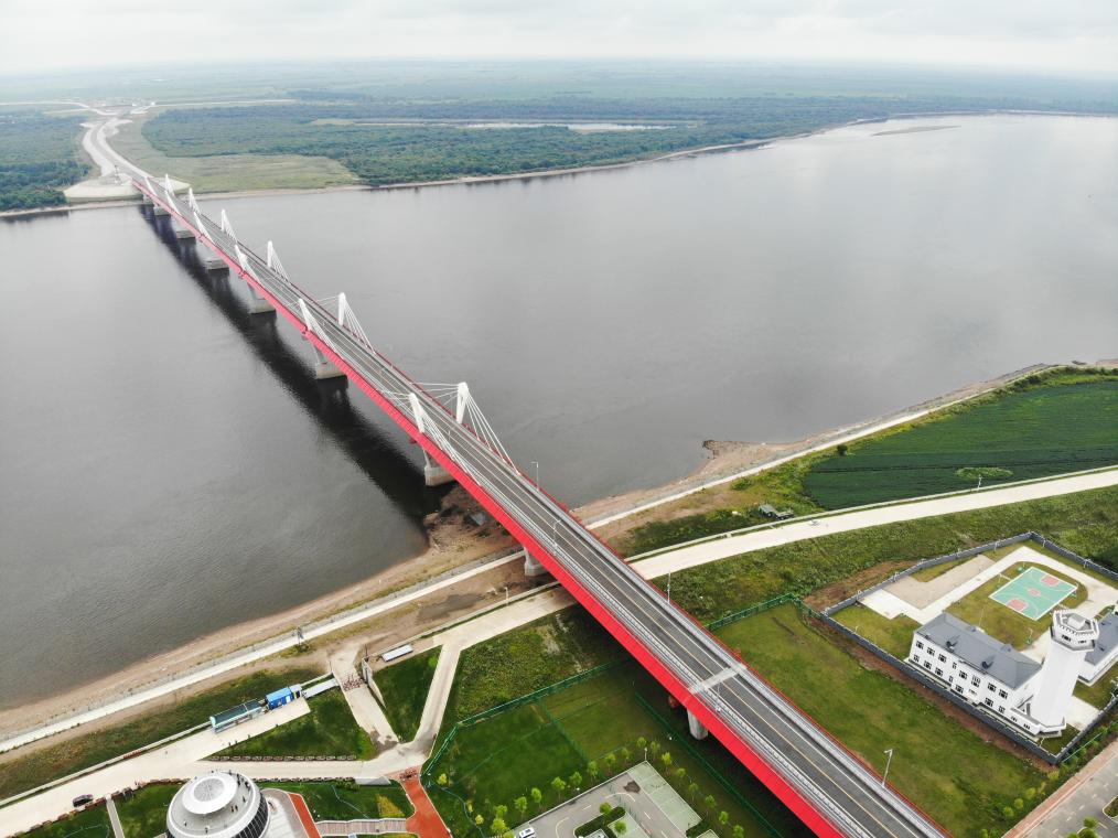 這是2023年8月11日在中國黑河一側(cè)拍攝的黑河-布拉戈維申斯克公路橋(無人機(jī)照片)。新華社記者王松攝