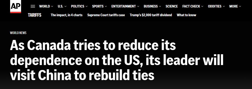 美聯(lián)社報(bào)道稱,加拿大總理此次訪華,旨在修復(fù)并改善兩國(guó)關(guān)系,為中加戰(zhàn)略伙伴關(guān)系的發(fā)展重新注入活力。報(bào)道援引卡尼的表態(tài)指出:“加拿大正在全球范圍內(nèi)構(gòu)建新的伙伴關(guān)系,以改變本國(guó)經(jīng)濟(jì)對(duì)單一貿(mào)易伙伴的依賴?!?/p>