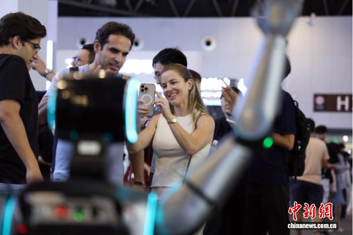 2025年7月,在上海舉辦的2025世界人工智能大會上,一款中國制造的機器人吸引外國觀眾。 中新社記者 湯彥俊 攝