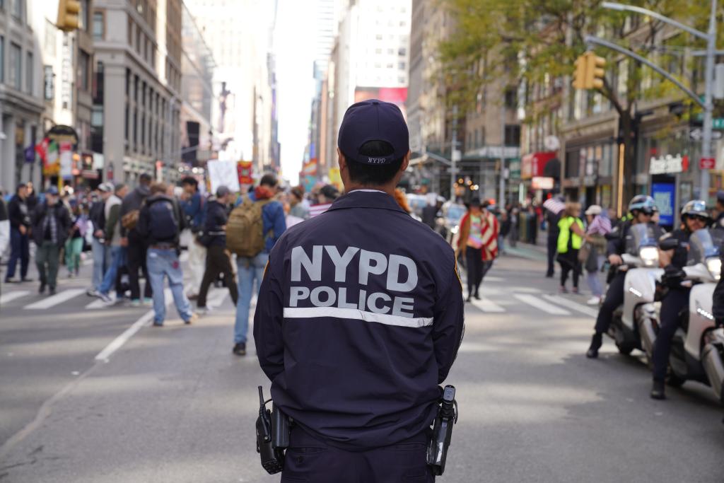 2025年10月18日,在美國紐約,警察在示威游行活動現(xiàn)場執(zhí)勤。新華社記者張鳳國攝