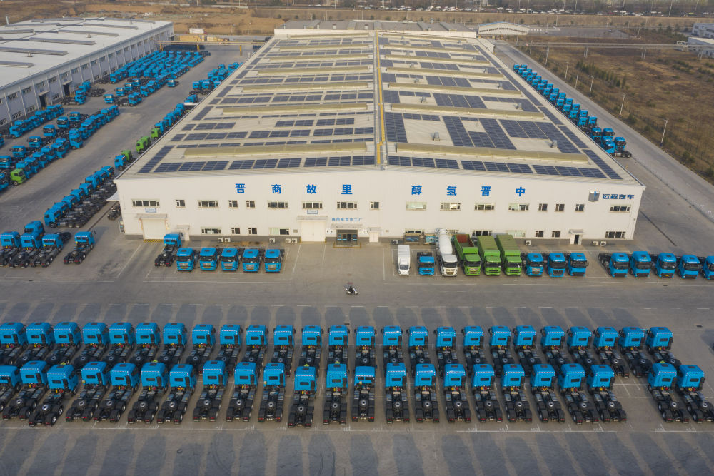 這是在位于山西省晉中市榆次區(qū)的山西新能源汽車工業(yè)有限公司(吉利晉中基地)拍攝的甲醇重卡(4月1日攝,無(wú)人機(jī)照片)。新華社記者 楊晨光 攝