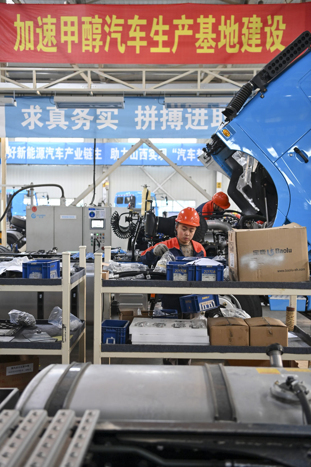 工作人員在位于山西省晉中市榆次區(qū)的山西新能源汽車工業(yè)有限公司(吉利晉中基地)生產(chǎn)甲醇重卡(4月1日攝)。新華社記者 楊晨光 攝