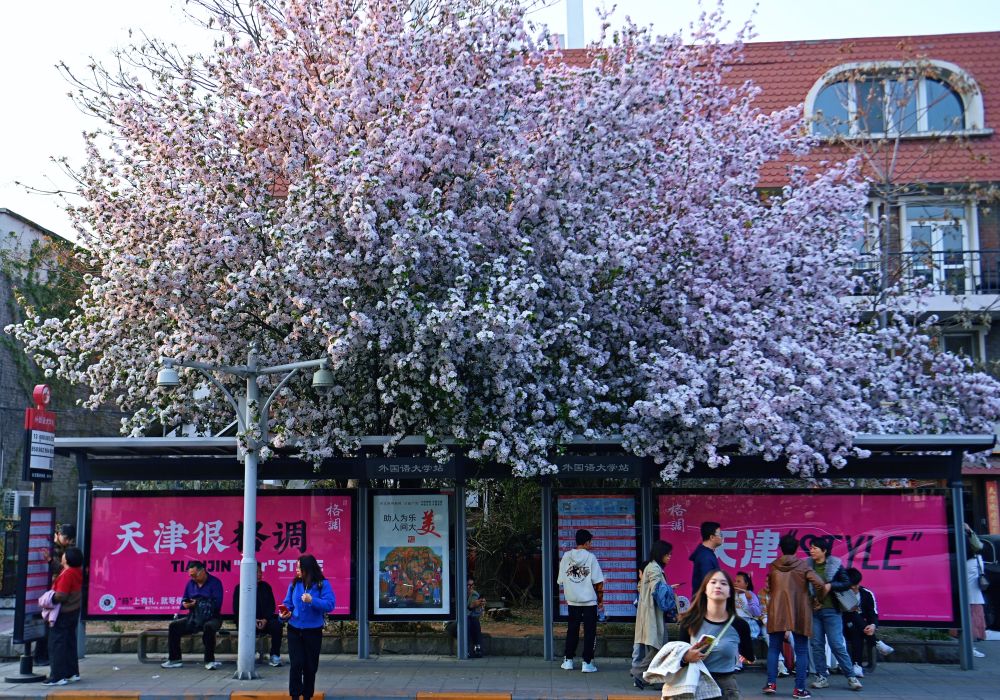 位于天津五大道馬場道的天津外國語大學公交站旁的海棠花盛開(4月6日攝)。