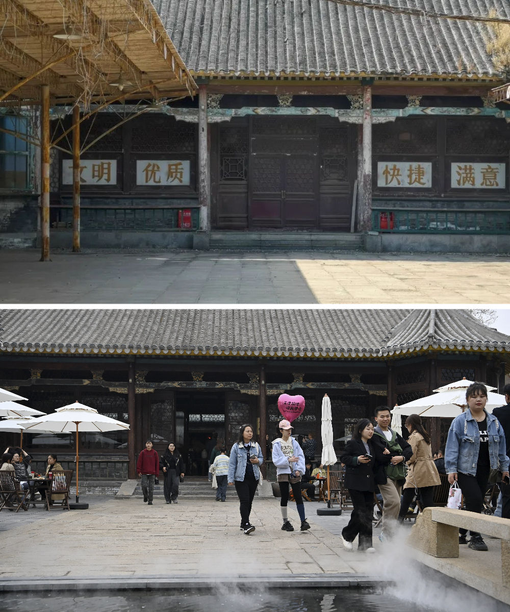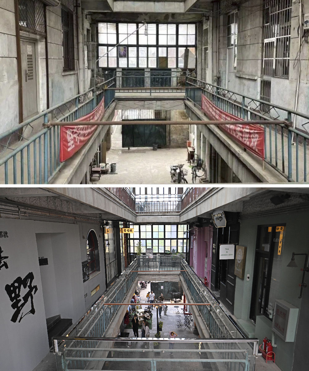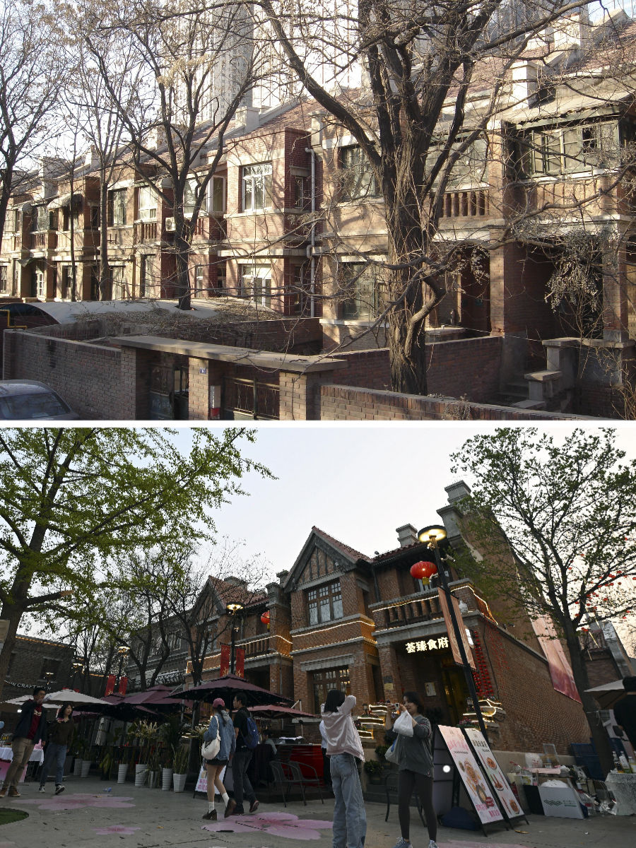 拼版照片:上圖是改造前的先農(nóng)大院(資料照片)。下圖是游客在位于五大道的先農(nóng)大院內(nèi)游覽(4月6日攝)。始建于1925年的先農(nóng)大院是五大道建成最早的建筑群之一,融合了英式聯(lián)排住宅、英式獨棟別墅等多種特色的建筑風格。歲月變遷,這些建筑一度損壞嚴重,配套設(shè)施老化。2006年起,天津啟動先農(nóng)大院整理項目,對街區(qū)居民進行了騰遷,對建筑進行了加固修繕,恢復了街區(qū)的歷史原貌,引進了餐飲、文化展示、辦公等業(yè)態(tài),使這里形成了環(huán)境優(yōu)雅的公共藝術(shù)和展示建筑遺產(chǎn)的城市新空間。