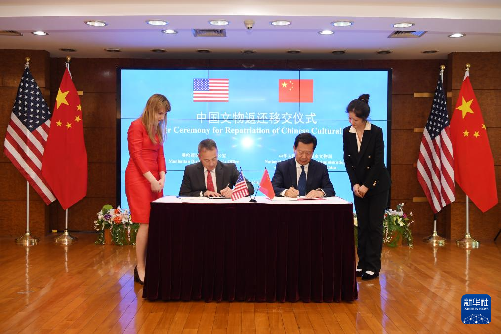 4月17日,在美國紐約中國駐紐約總領(lǐng)館,中美雙方代表出席中國流失文物藝術(shù)品返還移交儀式。新華社記者 李睿 攝