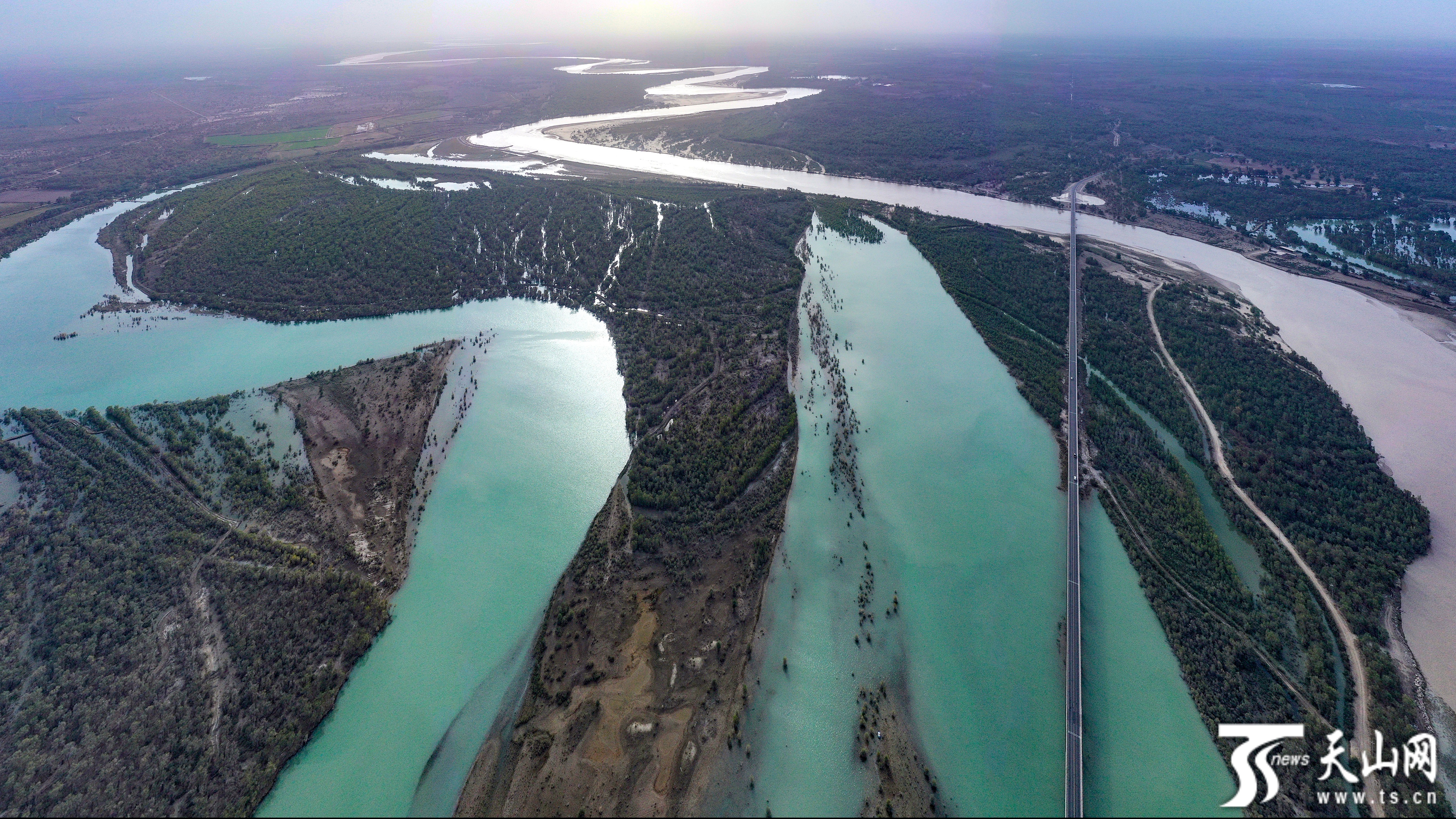 2023年9月7日,塔里木河蜿蜒流淌,兩岸旁沙雅縣境內(nèi)分布的290余萬畝原始胡楊林在河水滋潤(rùn)下生機(jī)盎然。蔡增樂攝