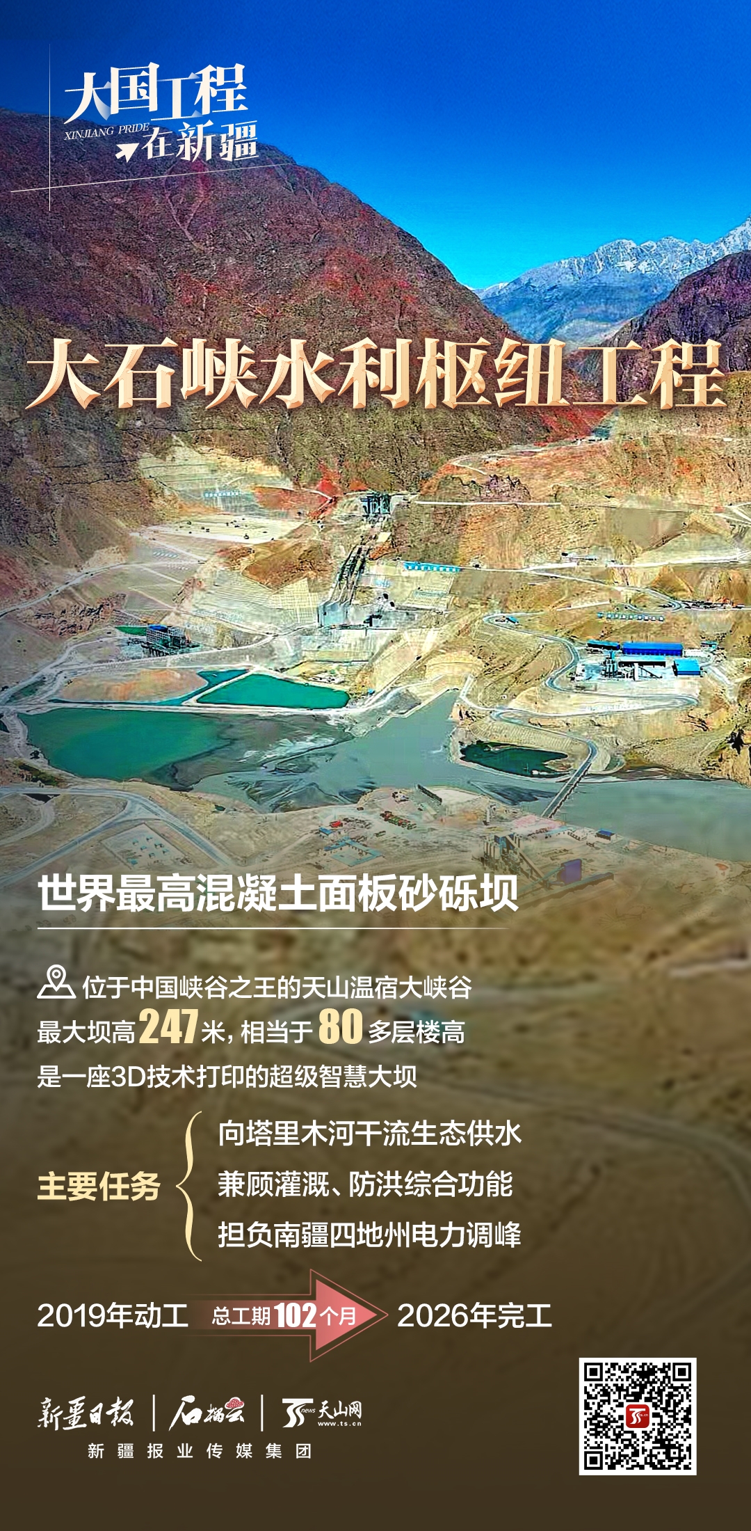 新疆大石峽水利樞紐工程建在號(hào)稱中國(guó)峽谷之王的天山溫宿大峽谷之中,攔河壩主壩為混凝土面板砂礫石壩,最大壩高247米,壩頂長(zhǎng)度606米,比三峽大壩還高62米,是當(dāng)之無愧的天塹工程。