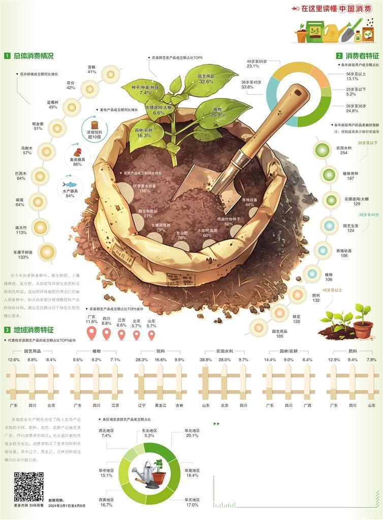 此外,畜牧業(yè)生產(chǎn)、城市花草種植需求也成為春耕消費(fèi)的新亮點(diǎn)。鄉(xiāng)村養(yǎng)殖戶抓住春季時(shí)節(jié)推進(jìn)畜禽填槽補(bǔ)欄,濃縮飼料、禽類器具、水產(chǎn)器具成為受歡迎的產(chǎn)品,其中濃縮飼料的成交額同比增長(zhǎng)超10倍。城市居民購(gòu)買了更多的花卉綠植,為自家陽(yáng)臺(tái)、花園、辦公室增添濃濃春意,車?yán)遄訕?shù)苗、南天竹、巴西木、郁金香是最受青睞的品類。