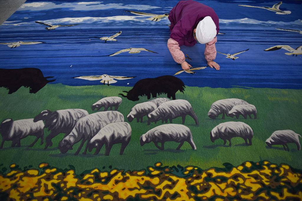 2023年2月21日,在西寧市圣源地毯集團(tuán)生產(chǎn)車間,操作工檢查毯面、拔花刺。新華社記者吳剛攝