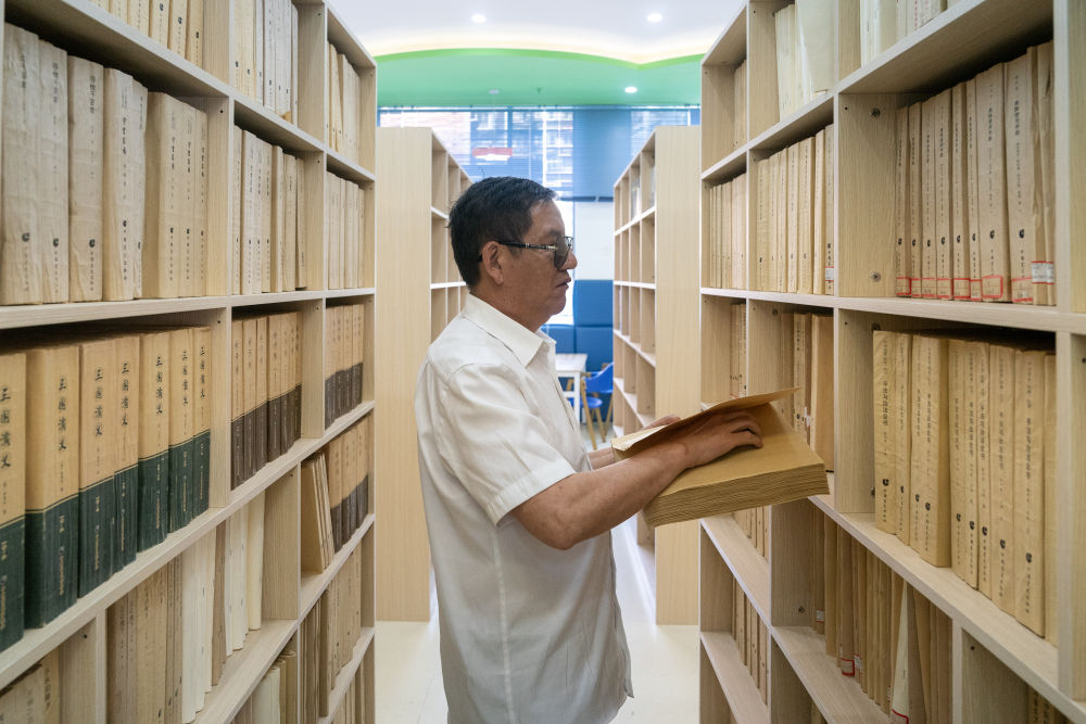 4月15日,昆明市盲啞學(xué)校教師彭斌在學(xué)校圖書室查找盲文書。(新華社記者 陳欣波 攝)