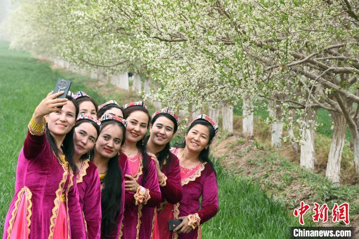 4月15日,新疆伽師縣舉行第四屆新梅花開文學藝術采風活動。圖為新疆伽師縣米夏鄉(xiāng)的民眾在新梅花前自拍。中新網(wǎng)記者孫亭文攝