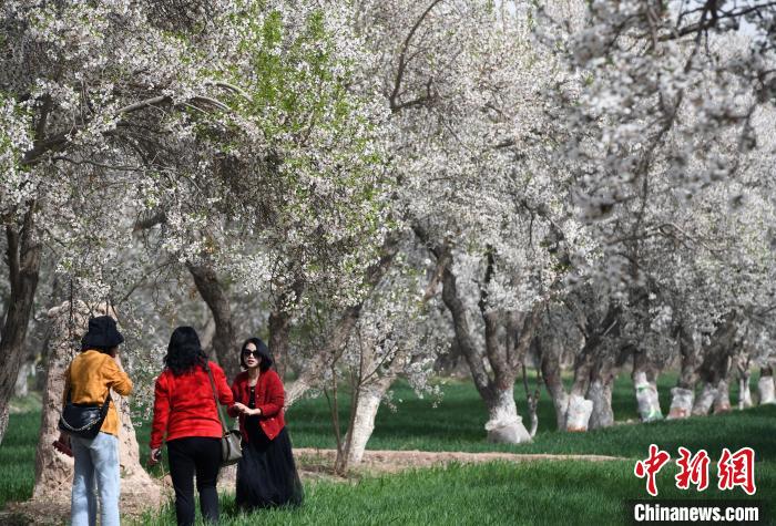 3月31日,多名游客在新疆阿克陶縣塔爾塔吉克民族鄉(xiāng)巴格艾格孜村的杏花樹下拍照。中新網(wǎng)記者孫亭文攝