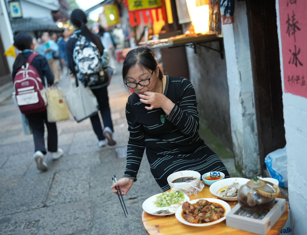 浙江紹興倉橋直街,人來客往。傍晚,居民童秀娟把小飯桌搬到家門口,倚街而坐,拈起一只醉蝦嘬起來。尋常煙火味,彌散開來。
