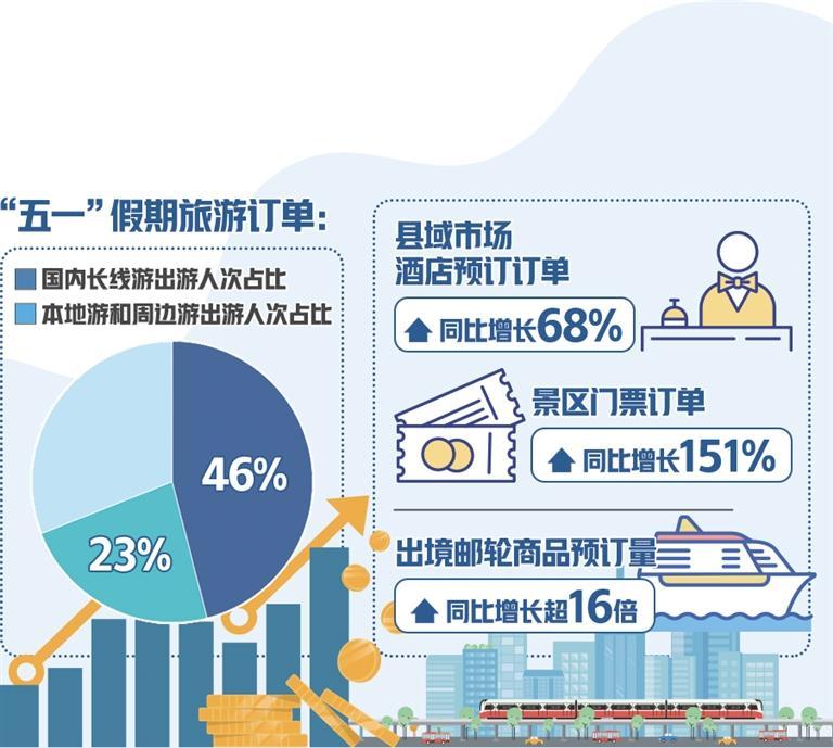 從出游目的地看,北京、上海、重慶、杭州、成都、南京、西安、武漢、廣州等城市是熱門(mén),帶動(dòng)相關(guān)交通和酒店訂單量走高。去哪兒旅行網(wǎng)顯示,北京—上海、成都—西安、上海—武漢、深圳—長(zhǎng)沙、北京—青島等熱門(mén)線路的火車(chē)票預(yù)約購(gòu)票難度不低于春運(yùn);從上海、北京、深圳、廣州、杭州、南京等地出發(fā),飛往旅游城市的機(jī)票平均支付價(jià)格走高,北京—成都、上海—昆明等熱門(mén)航線的部分航班已升至全價(jià);在攜程旅行網(wǎng)上,天水、徐州、淄博、合肥、南昌、迪慶、煙臺(tái)等城市的“五一”假期酒店預(yù)訂增速明顯;四線及以下城市,尤其是縣域旅游市場(chǎng)帶來(lái)新增量,縣域市場(chǎng)酒店預(yù)訂訂單同比增長(zhǎng)68%、景區(qū)門(mén)票訂單同比增長(zhǎng)151%。