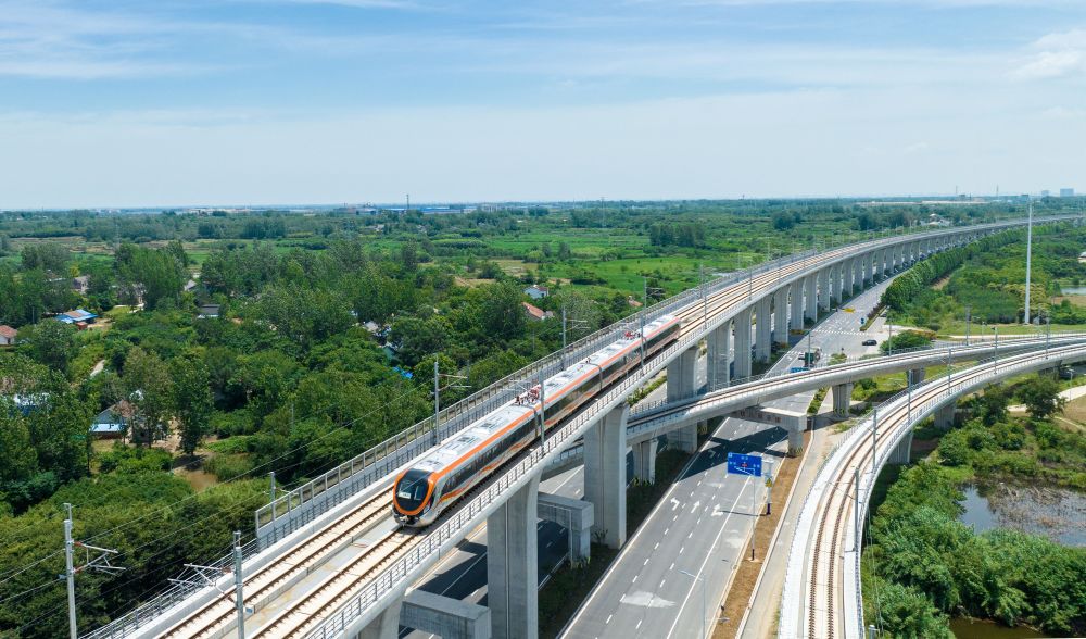 這是在滁州市拍攝的滁寧城際鐵路列車(2023年6月28日攝,無人機(jī)照片)。新華社記者 劉軍喜 攝