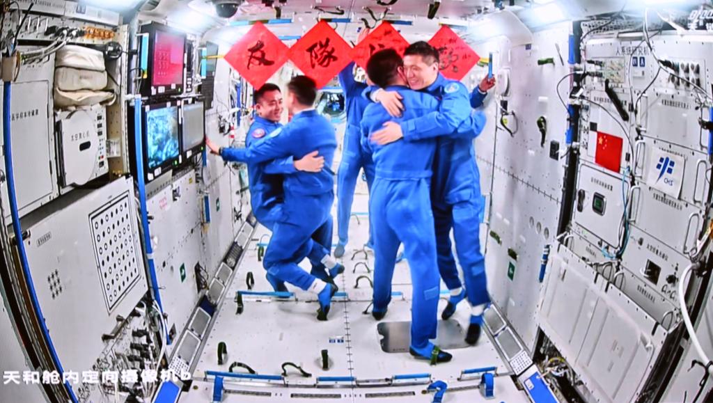 2023年10月26日17時(shí)46分,神舟十七號(hào)載人飛船成功對(duì)接于空間站天和核心艙前向端口。19時(shí)34分,神舟十六號(hào)航天員乘組順利打開(kāi)“家門(mén)”,歡迎遠(yuǎn)道而來(lái)的神舟十七號(hào)航天員乘組入駐“天宮”。隨后,兩個(gè)航天員乘組拍下“全家?!?,共同向全國(guó)人民報(bào)平安。