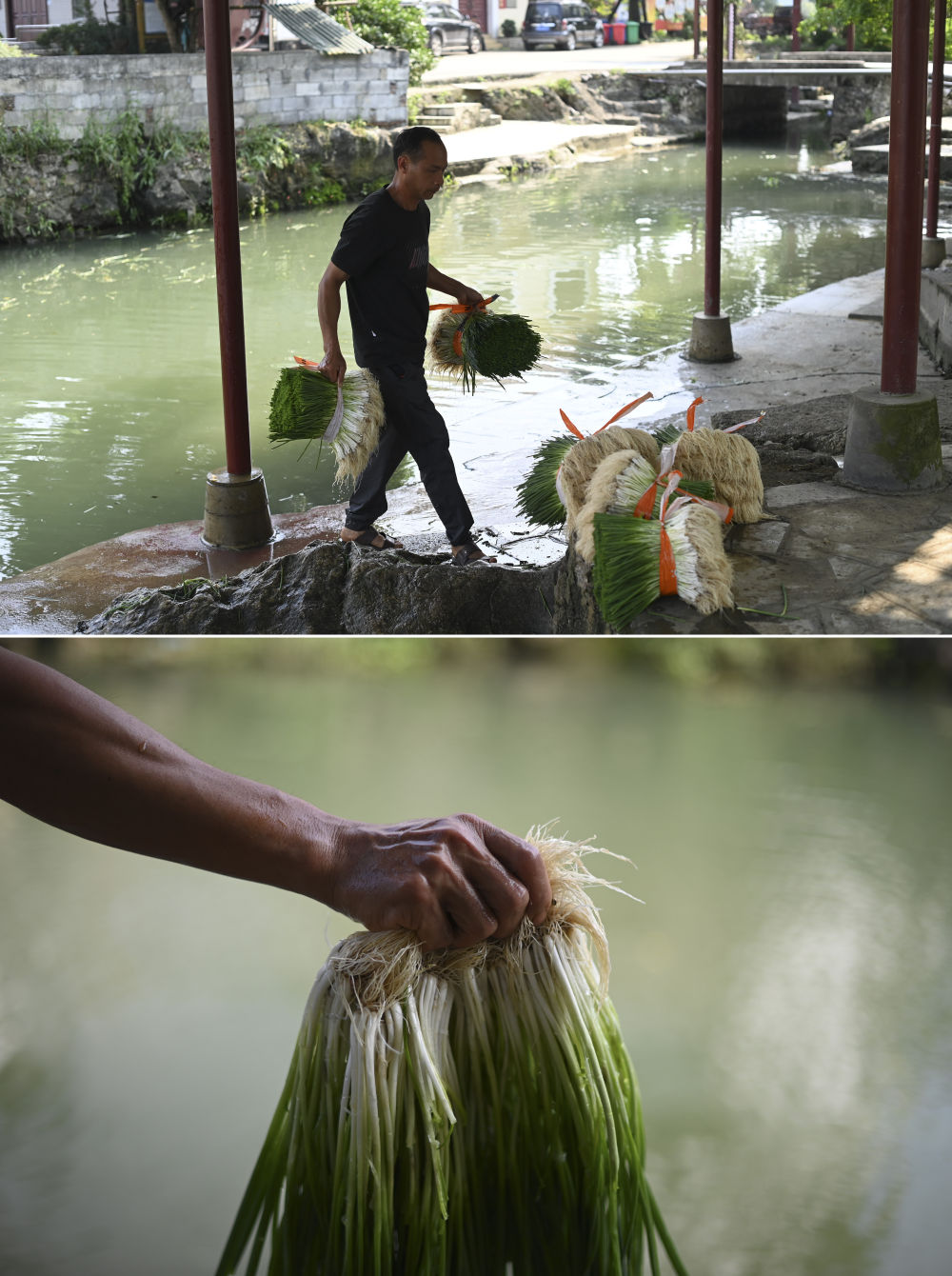 在廣西柳州市柳江區(qū)三都鎮(zhèn)覺山村,村民韋文中搬運香蔥,準備供應市場(4月16日攝)。香蔥種植產(chǎn)業(yè)是覺山村村民增收致富的支柱產(chǎn)業(yè),韋文中種植10多畝香蔥。