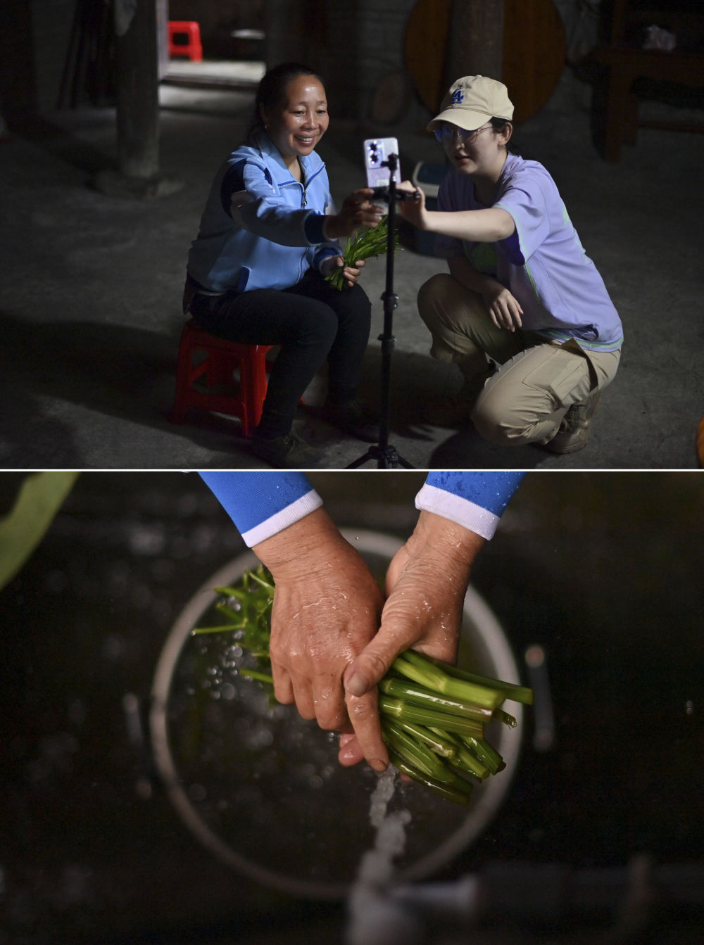 上圖:在廣西柳州市融水苗族自治縣桿洞鄉(xiāng)烏英苗寨,48歲的梁足英(左)向大學生學習直播帶貨;下圖:梁足英在洗野菜,準備銷往縣城(4月30日攝)。近年來,她積極參加夜校學習,并通過網(wǎng)絡直播銷售當?shù)厥卟恕?/p>