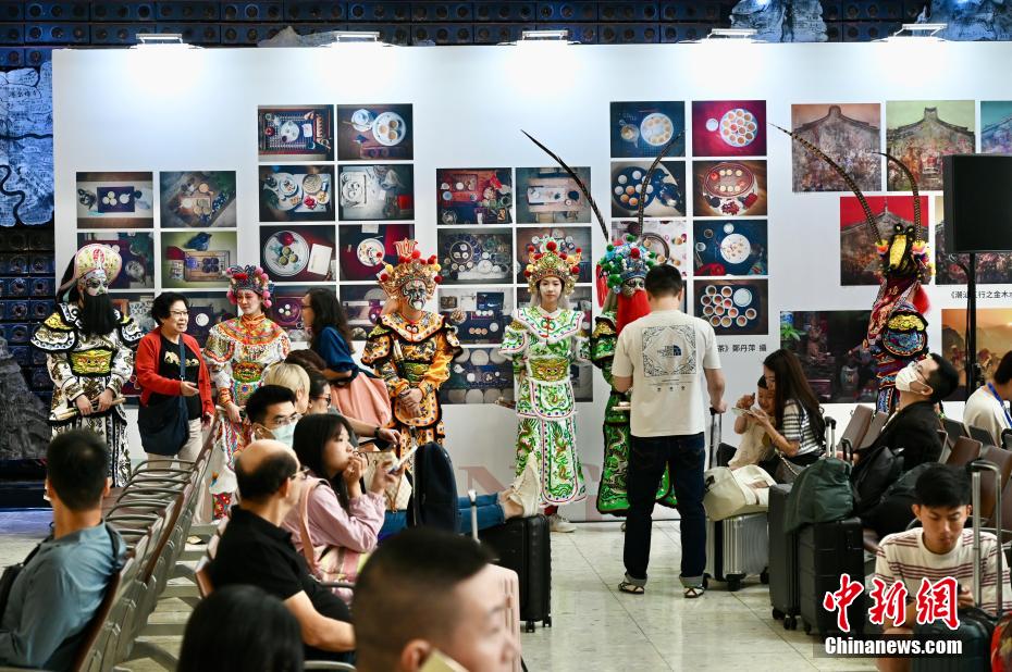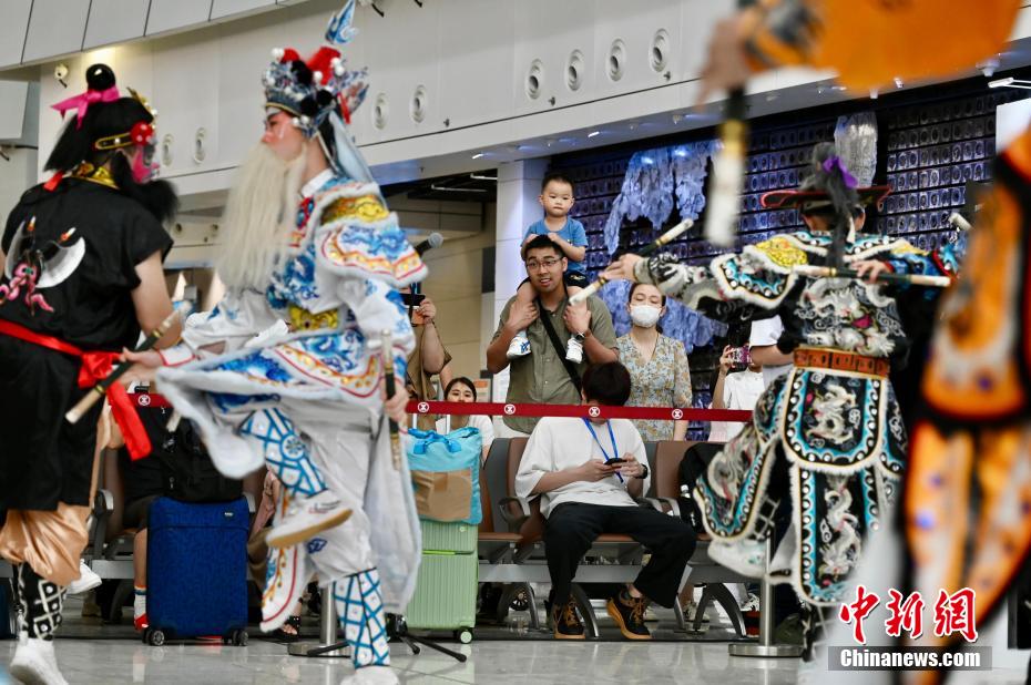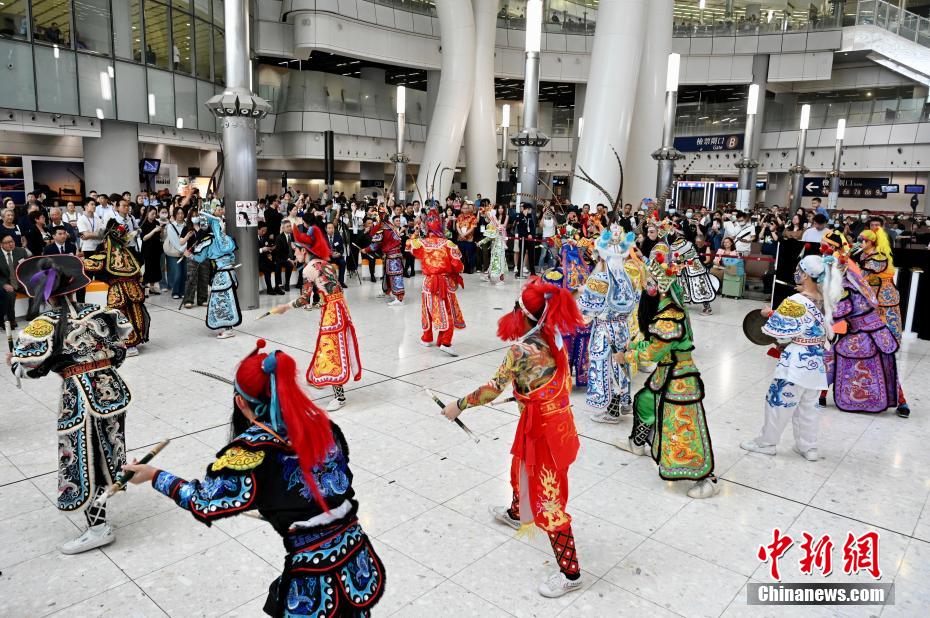 圖為英歌舞表演吸引大批旅客觀(guān)看。