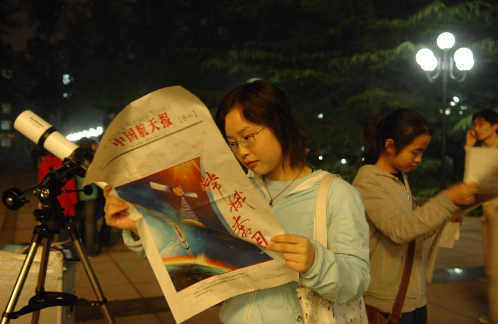 2007年10月24日,北京航空航天大學(xué)一名學(xué)生在翻看《中國(guó)航天報(bào)》號(hào)外。新華社記者 羅曉光 攝