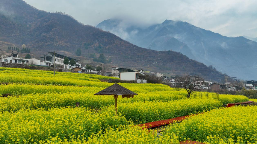 隴南市文縣玉壘鄉(xiāng)的油菜花海(無人機(jī)照片)。新華社記者 郎兵兵 攝