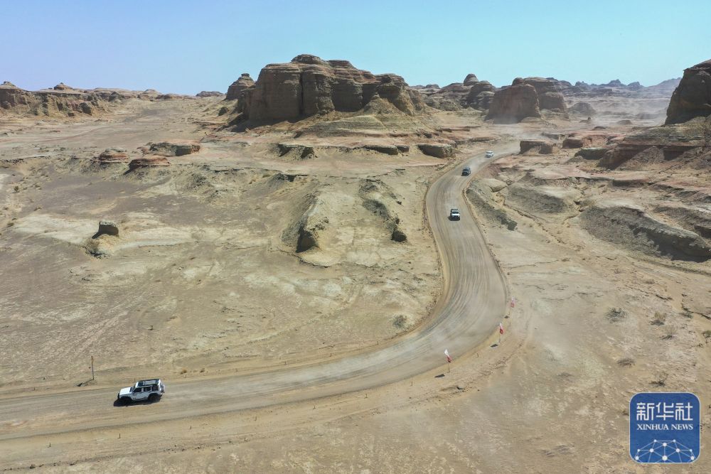 在新疆克拉瑪依市烏爾禾區(qū)世界魔鬼城景區(qū),車(chē)友在自駕線路上疾馳(5月1日攝,無(wú)人機(jī)照片)。