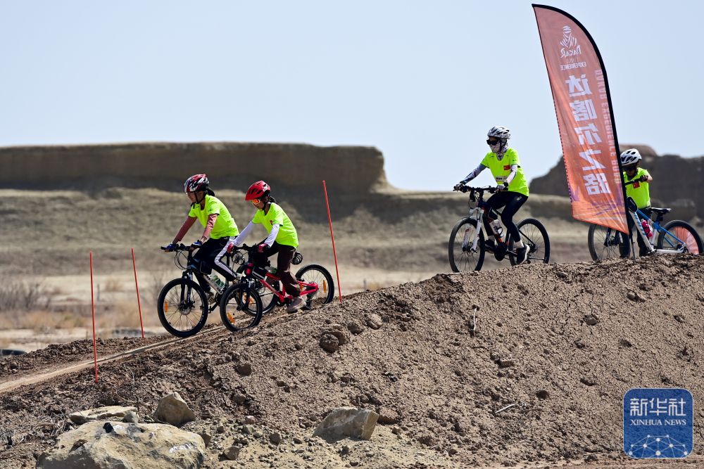 在新疆克拉瑪依市烏爾禾區(qū)世界魔鬼城景區(qū),小朋友們?cè)谧择{線路上體驗(yàn)自行車(chē)越野(5月1日攝)。