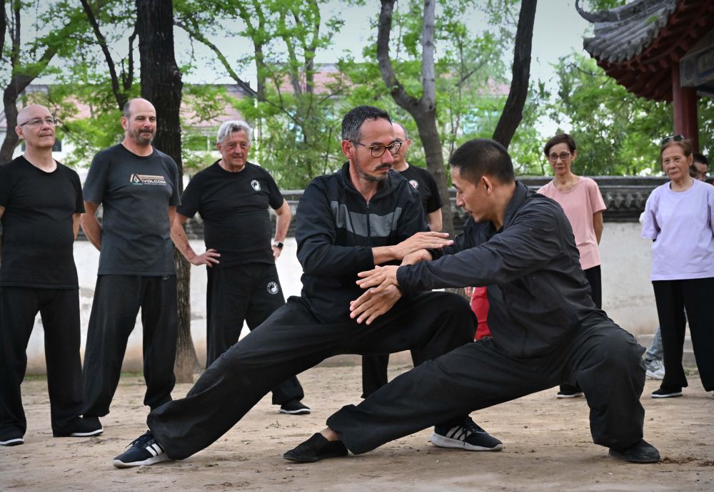 ↑2024年4月20日,在河南溫縣陳家溝楊露禪學(xué)拳處,來自法國波爾多的陳少拳(左)與師父陳自強(qiáng)交流太極推手。