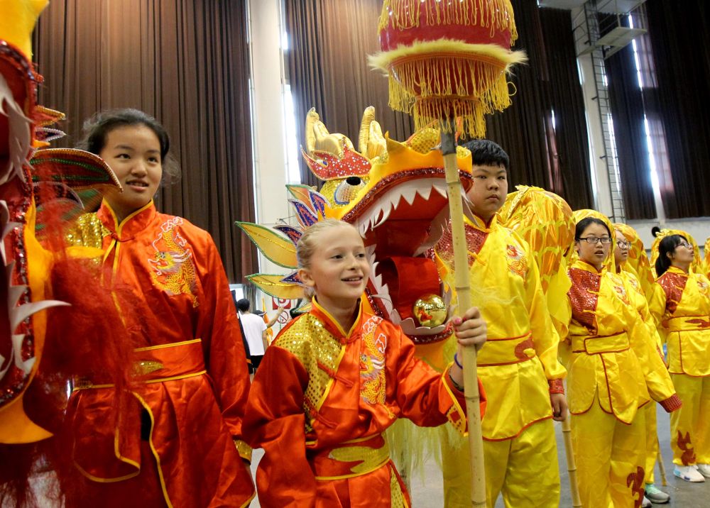 ↑2016年6月9日,上海向明初級中學(xué)的學(xué)生、法國女孩凱米(左二)在學(xué)校龍獅隊(duì)中擔(dān)任引獅人的表演任務(wù)。