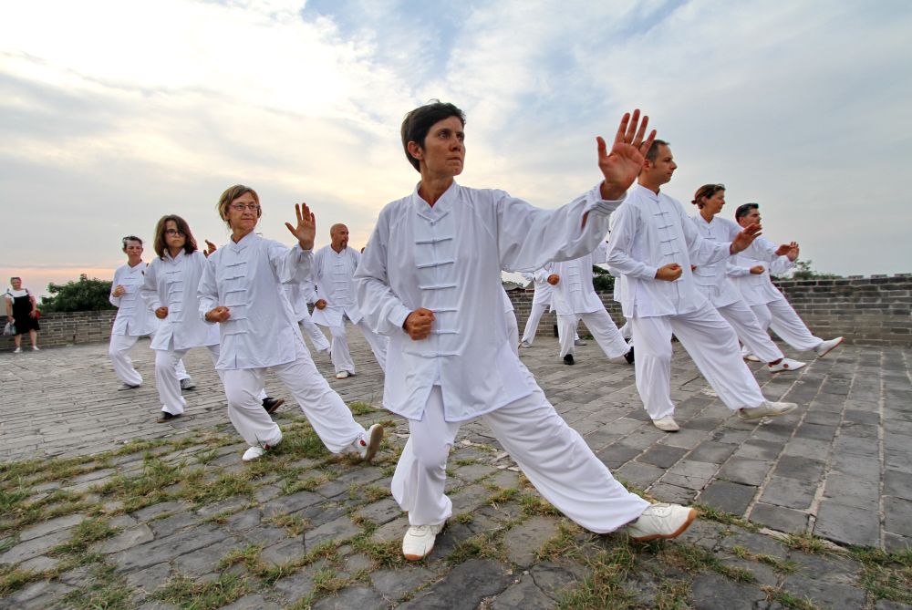 ↑2017年8月10日,來自法國的太極拳愛好者在河北省永年縣廣府古城城墻上展示太極拳。