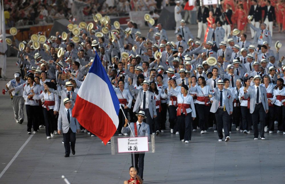 ↑2008年8月8日,法國奧運(yùn)代表團(tuán)在北京奧運(yùn)會開幕式上入場。