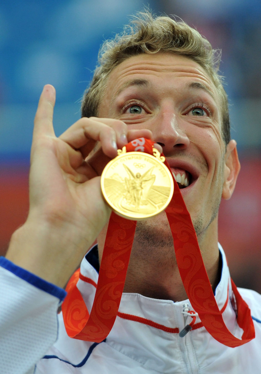 ↑2008年8月14日,法國選手阿·貝爾納在北京奧運(yùn)會男子100米自由泳頒獎(jiǎng)儀式后展示金牌。