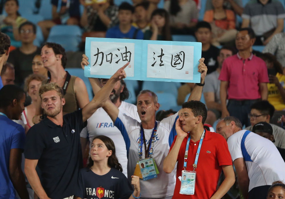 ↑2014年8月25日,一名法國觀眾在南京青奧會田徑項(xiàng)目男子標(biāo)槍決賽場邊高舉用中文書寫的“加油法國”標(biāo)語為法國選手盧卡斯·穆塔德加油。