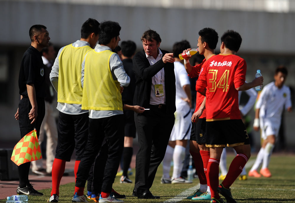 ↑2013年4月13日,時(shí)任深圳紅鉆隊(duì)法國主教練特魯西埃(中)在2013/2014賽季中國足球甲級聯(lián)賽第五輪中布置戰(zhàn)術(shù)。