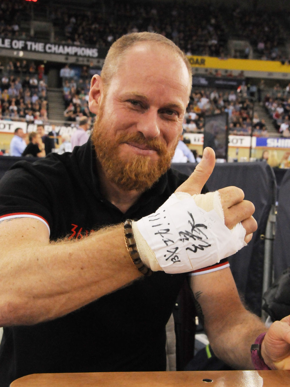↑2016年3月6日,2016場地自行車世錦賽賽場上,中國隊(duì)的法國籍教練韋蒂展示右手繃帶上的漢字“成功?。?!緣”。