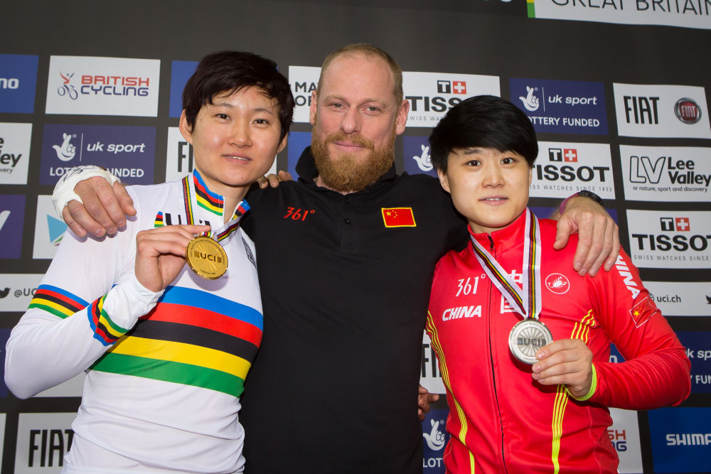 ↑2016年3月6日,中國隊(duì)選手鐘天使(左)、鐘俊紅(右)在2016場地自行車世錦賽女子競速賽決賽后與法國籍教練伯努瓦·韋蒂合影。