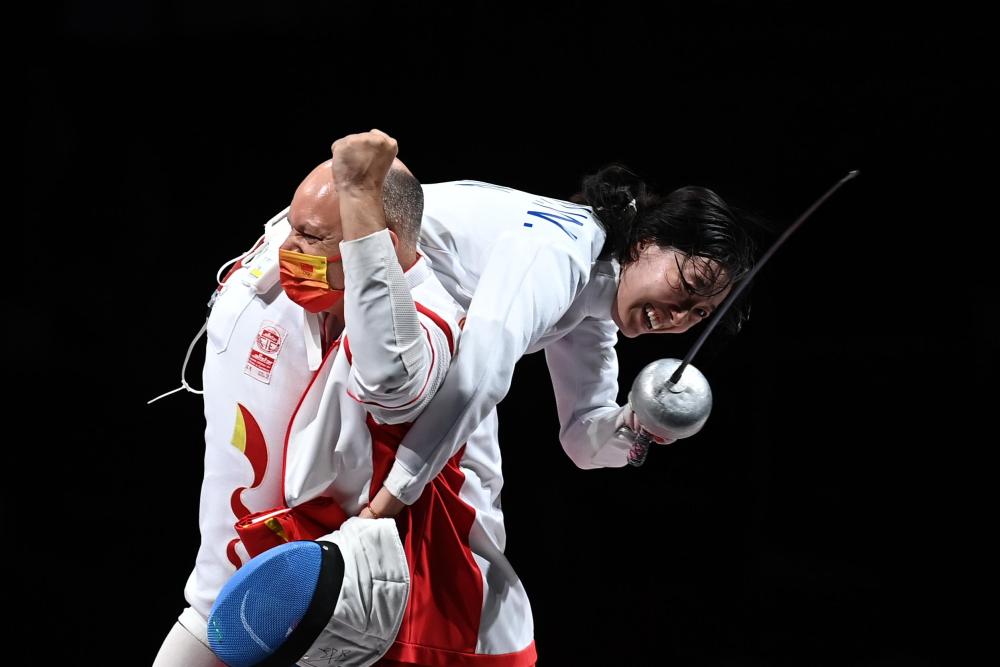 ↑2021年7月24日,孫一文(右)與法國籍主教練雨歌·歐伯利在東京奧運(yùn)會擊劍項(xiàng)目女子個(gè)人重劍決賽奪冠后慶祝。