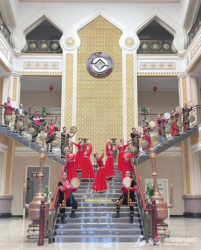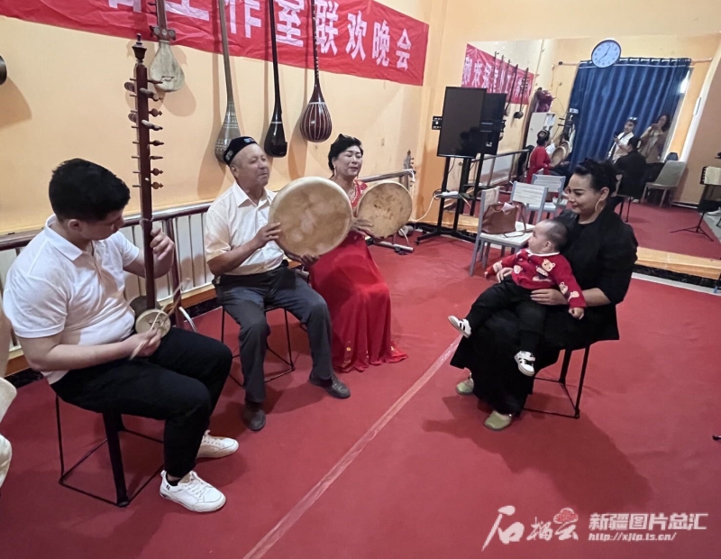 在哈密市非物質(zhì)文化遺產(chǎn)保護中心,回城鄉(xiāng)的傳承人們和當?shù)匮輪T進行哈密木卡姆表演。石榴云/新疆日報記者 王晶晶攝