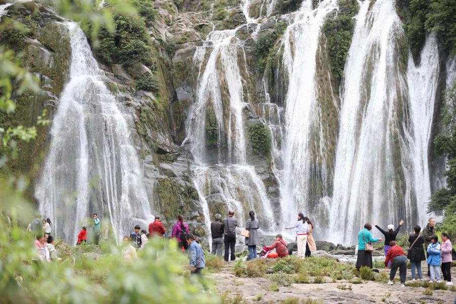 5月1日,游客在貴州省丹寨縣龍泉鎮(zhèn)排廷村瀑布觀賞游玩。新華社發(fā)(楊武魁攝)