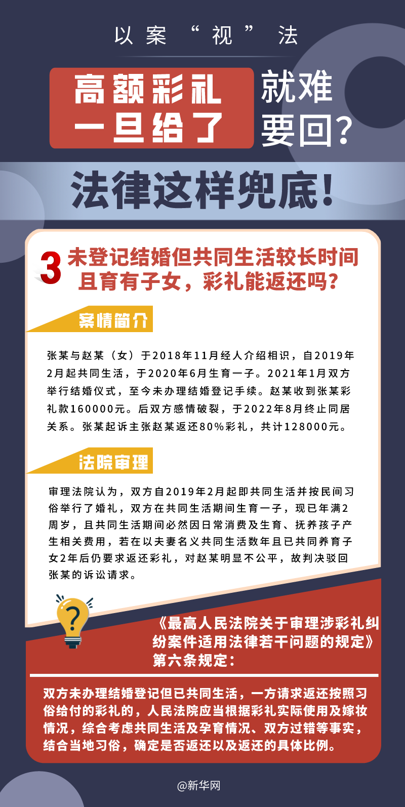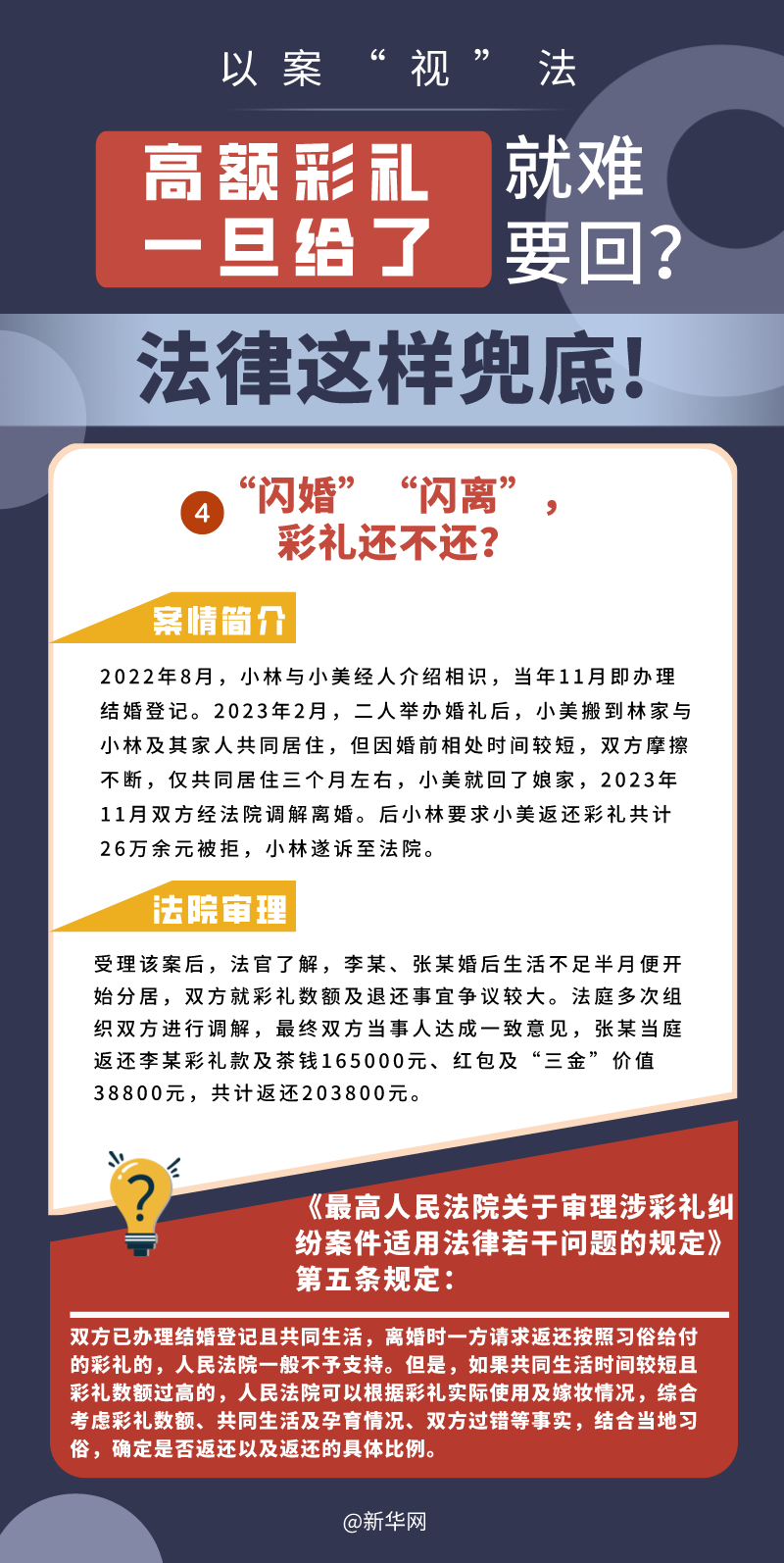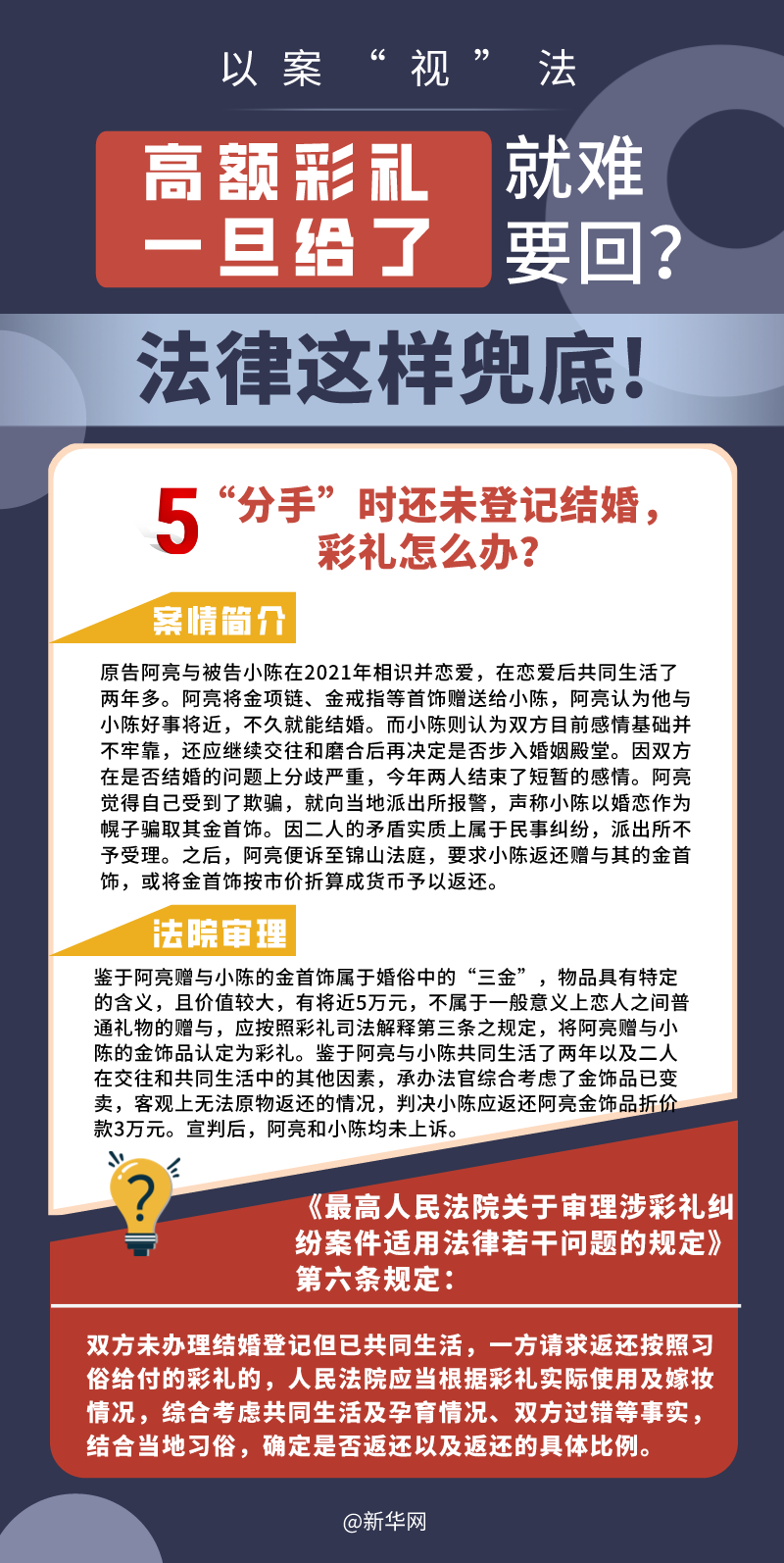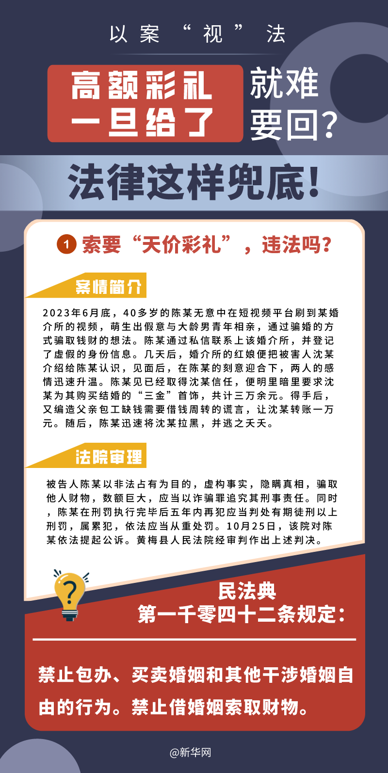 “五一”長假期間,各地迎來了婚禮高峰期,“彩禮”話題,尤其農(nóng)村高額彩禮現(xiàn)象備受關(guān)注。破解高價(jià)彩禮,在解決爭議的層面,司法盡了最大努力兜底。本期《以案“視”法》針對(duì)涉“高額彩禮”糾紛,帶大家學(xué)習(xí)相關(guān)法律知識(shí)。