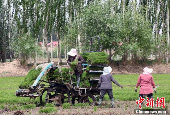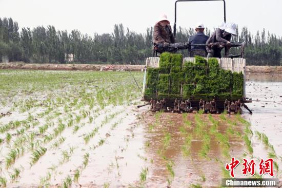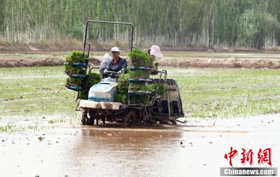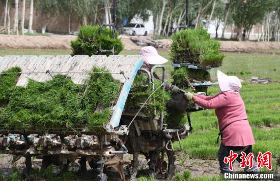 5月13日,在位于該市帕哈太克里鄉(xiāng)的“海水稻”種植基地,各類機(jī)械和工作人員都忙碌起來,搶抓農(nóng)時(shí)進(jìn)行“海水稻”播種工作。隨著氣溫回升,新疆喀什市的1.3萬畝“海水稻”進(jìn)入插秧期。圖為工作人員駕駛著插秧機(jī),搶抓農(nóng)時(shí)進(jìn)行“海水稻”播種工作。
