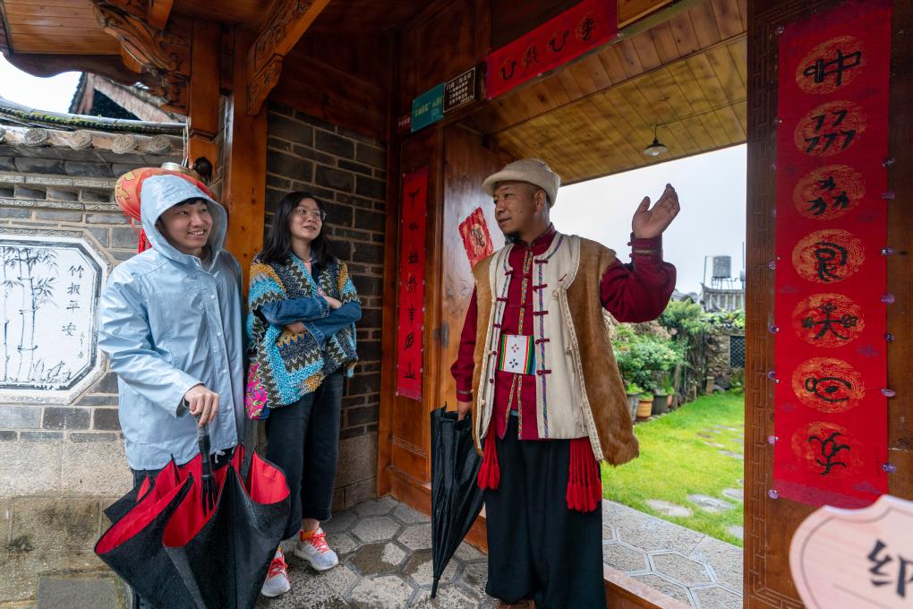 云南省麗江市玉龍納西族自治縣白沙鎮(zhèn)玉湖村村民和杰林(右)為來自北京的游客介紹納西族東巴文(2023年8月28日攝)。新華社記者 陳欣波 攝