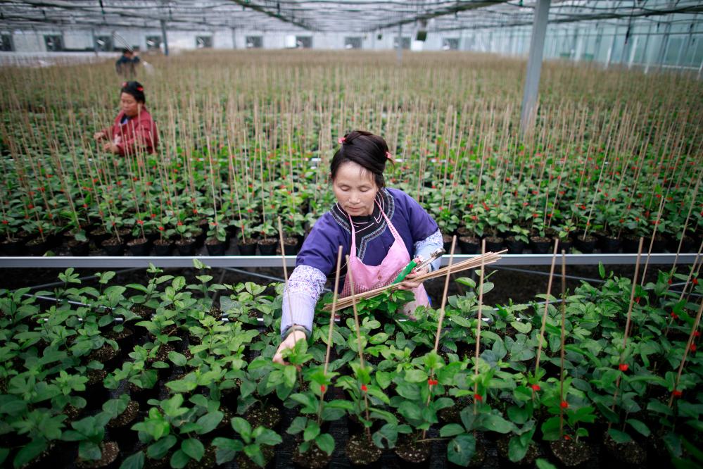 在貴州省榕江縣車江壩區(qū)智慧育苗中心內(nèi),一名少數(shù)民族婦女在大棚內(nèi)對百香果苗進行管理(2023年2月28日攝)。新華社記者 劉續(xù) 攝