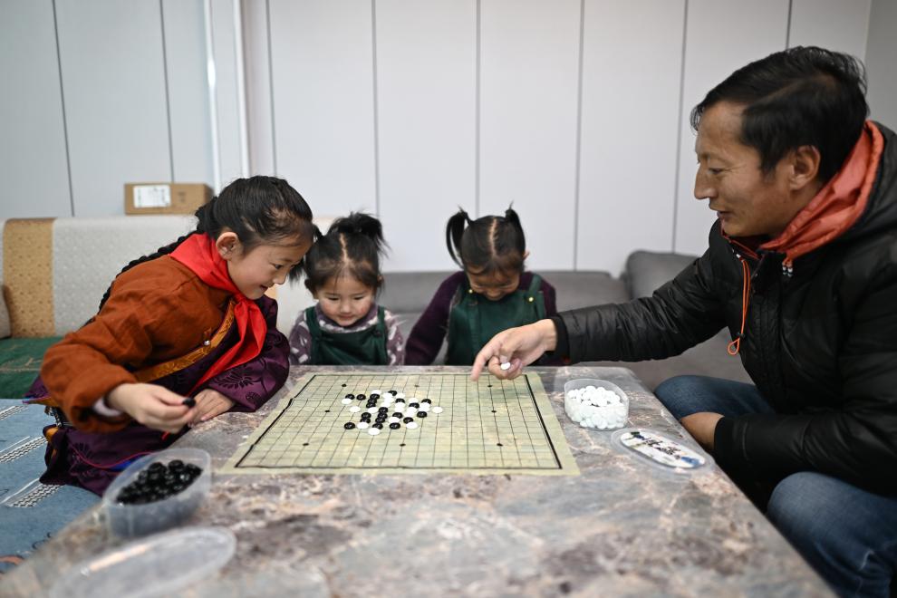 青海玉樹曲麻萊縣第二民族完全小學學生達沙旦增德金(左一)在家中和爸爸一起下五子棋(2024年1月12日攝)。新華社記者 張宏祥 攝