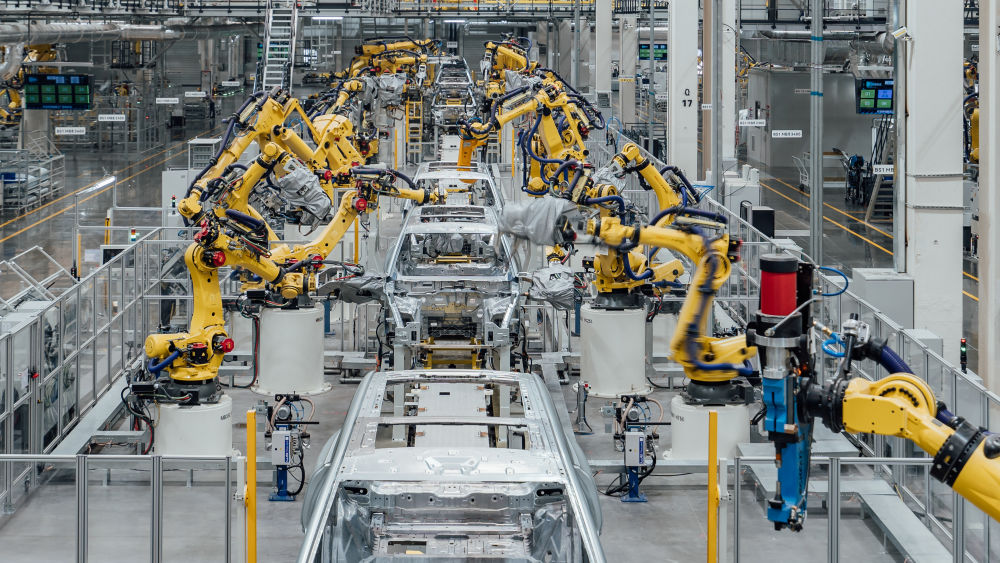 這是在重慶市兩江新區(qū)拍攝的賽力斯汽車超級工廠焊裝車間生產(chǎn)線(2024年2月26日攝,無人機(jī)照片)。新華社發(fā)(高彰 攝)