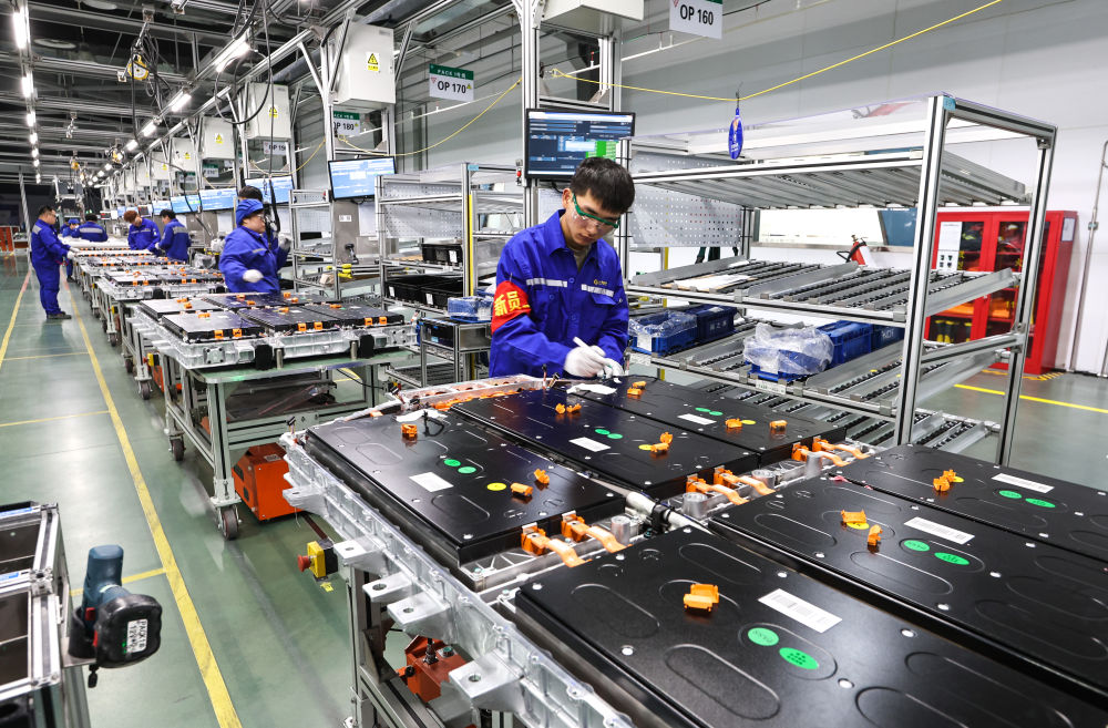 在上汽時(shí)代動(dòng)力電池系統(tǒng)有限公司車(chē)間,工人在安裝新能源汽車(chē)動(dòng)力電池系統(tǒng)(2023年2月16日攝)。
