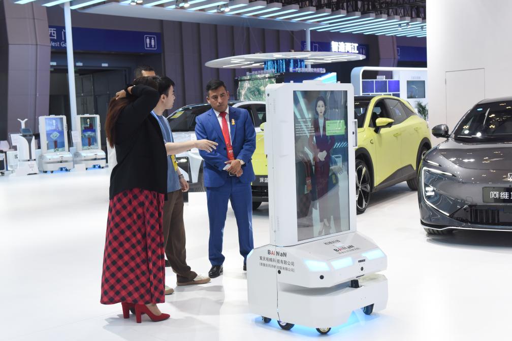 5月23日,工作人員在西洽會上給觀眾介紹講解機器人。新華社記者 張子彧 攝