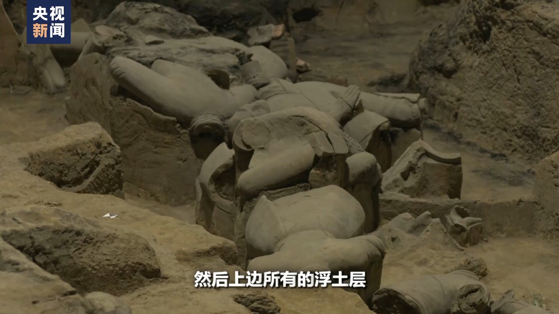 秦始皇帝陵博物院副院長 周萍:其實秦始皇帝陵博物院出土,不僅僅只有彩繪陶俑?,F(xiàn)在觀眾去現(xiàn)場去看的時候,最常看到的就是幾種材質(zhì),一種就是我們的彩繪陶俑,一種是坑內(nèi)的土遺址,一種我們銅車馬是金屬文物;其實在土遺址里面,有很多很多這種木質(zhì)的遺存。它這個就是我們這個隔梁在建的時候,實際上就相當于用木頭去搭了一個相當于小房子,把這些彩繪俑保存在里面。